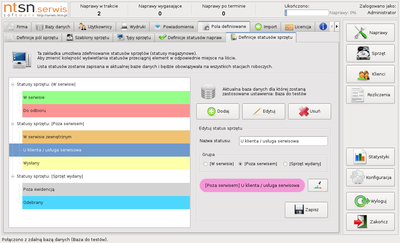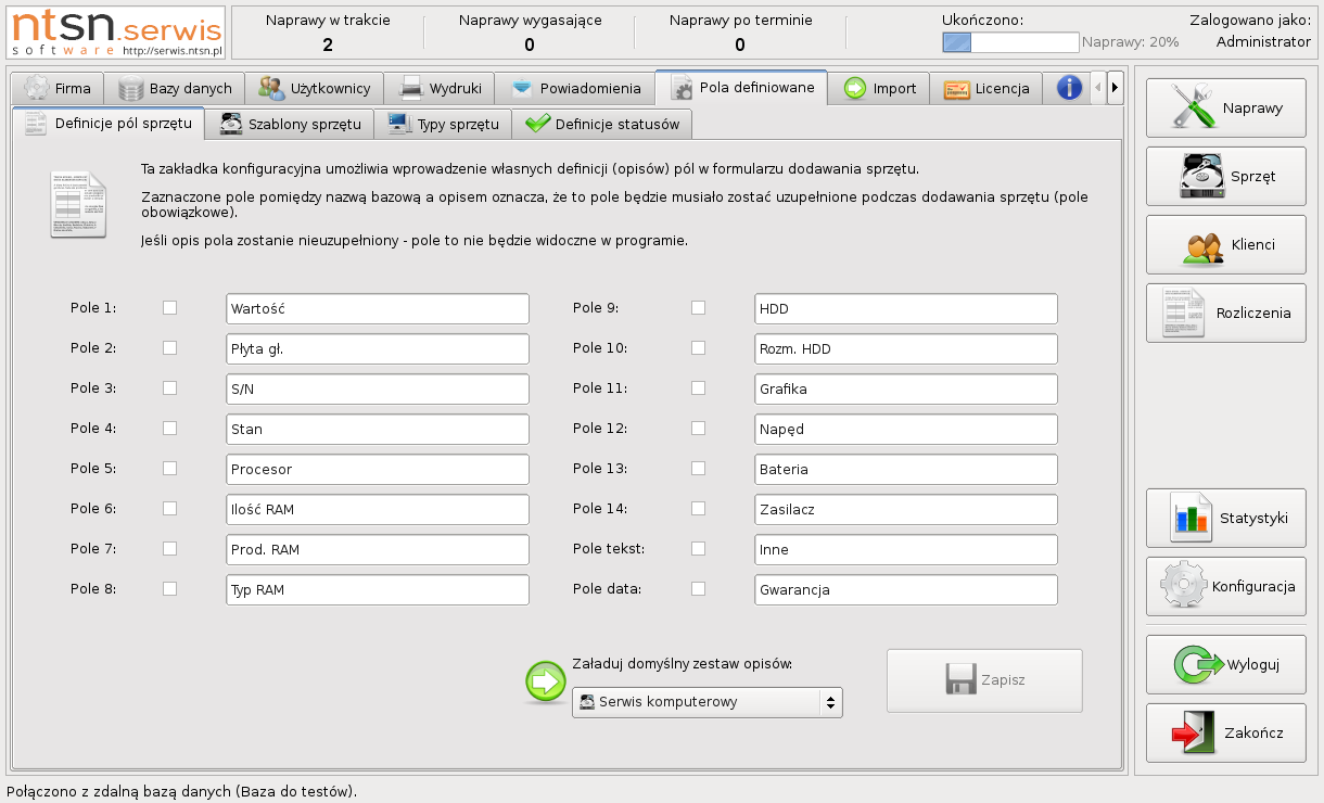 Program można skonfigurować wedle potrzeb. Możliwe jest definiowanie pól opisujących sprzęt, definiowanie typów sprzętu, statusów napraw oraz statusów magazynowych sprzętu. Możliwe jest ustawienie własnego szablonu numeracji napraw. Dzięki temu program można dopasować do niemal każdego typu serwisu sprzętowego.